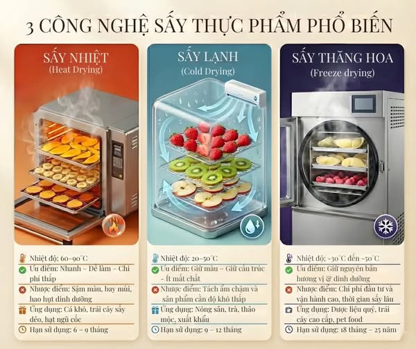 Nâng cấp hơn so với sấy nhiệt, sấy lạnh sử dụng không khí khô ở nhiệt độ thấp ($20-50^\circ C$) để tách ẩm. Điều này giúp thực phẩm không bị “nấu chín” bởi nhiệt độ cao.